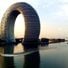 The circular structure creates an optical effect where the building appears to form a complete ring when reflected in the waters of Taihu Lake.