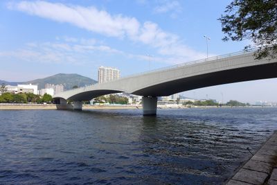 The Dragon Bridge extends across the river, connecting different sections of Sha Tin District with both pedestrian walkways and vehicle lanes.