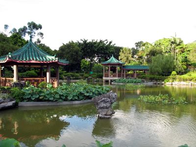 The park includes a traditional Chinese pavilion positioned next to a reflective lake, creating a connection between modern recreational spaces and regional architecture.