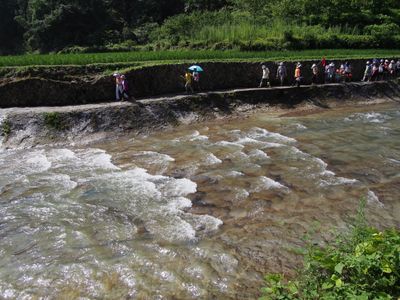 The riverbed of Baishuiyang extends across 40,000 square meters, featuring three large shallow pools with water flowing over smooth granite and lava formations.