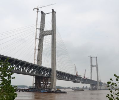 The Huanggang Yangtze River Bridge extends over 4000 meters across the waterway, incorporating both truss and cable-stayed structural elements within its design.