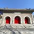 The Changxindian Fire God Temple features vermilion double doors with lion head handles contrasting against traditional gray walls and roof tiles.