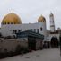A 25-meter minaret rises above the mosque, which combines Arabic architectural elements with double arches and multiple domes.