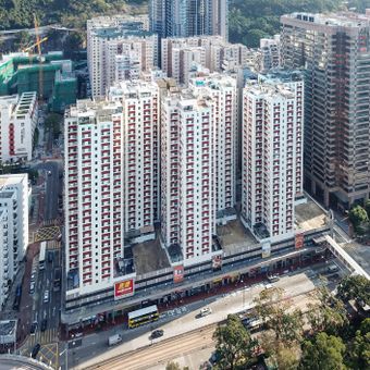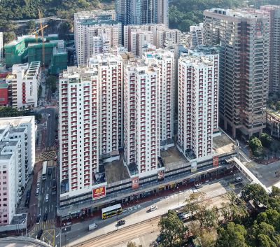 Healthy Gardens features multiple residential blocks with landscaped areas, situated above a shopping mall in a densely populated district of Hong Kong.