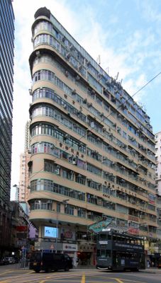 The Mei Wah Building stands 14 stories tall at the intersection of Johnston Road and Wan Chai Road, featuring an acute corner and teardrop-shaped terrace.