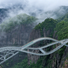 Ruyi Bridge connects two mountain peaks in Shenxianju Valley with three curved walkways made of steel, glass and titanium. The arches cross in the middle and form different levels connected by stairs.