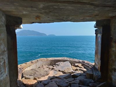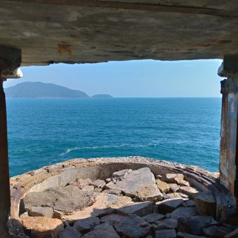 The coastal fortification contains multiple gun emplacements and observation points positioned along the eastern shoreline of Hong Kong Island, facing the Tathong Channel.