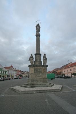 Maria column in Hořice, sloup se sochou P. Marie Immaculaty a se sochami sv. Petra, Pavla a Jana Evangelisty na náměstí Jiřího z Poděbrad v Hořicích