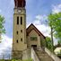 The Protestant church in Kraslice features a cube-structured bell tower with a tent roof and combines the church building with an attached parsonage.