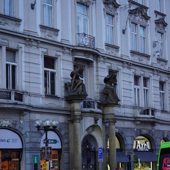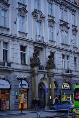 Sochy vlevo od štítu domu Staroměstské náměstí 7