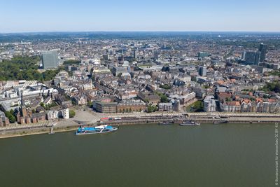 The Rheinturm telecommunications tower stands 240 meters tall above the river, marking the city center with its prominent needle-like structure.