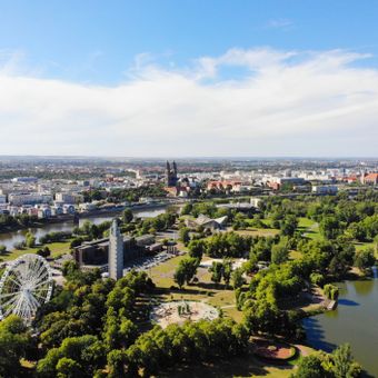 Magdeburg is a city along the Elbe River in Saxony-Anhalt, serving as the state capital and a historic member of the Hanseatic League with several universities and colleges. The Gothic cathedral rises on elevated ground near the riverbank, while the old town spreads north with several squares, narrow lanes and wider streets leading toward the main train station.