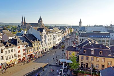 The central train station connects travelers to Frankfurt and Luxembourg, while numerous hotels and restaurants cluster around the Hauptmarkt square area.