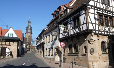 The Protestant church of St. Salvator stands in the center with its 36-meter tower, featuring a newly renovated organ funded by the Heinz family.