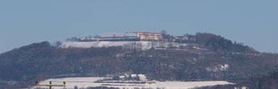 The pentagonal fortress sits on a hilltop 200 meters above Weißenburg, reaching an elevation of 630 meters with massive stone fortifications.