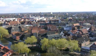 The city center of Nordhorn sits along the Vechte River, with water channels weaving through streets and neighborhoods creating multiple waterfront areas.