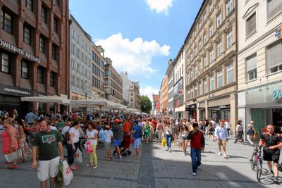 The street represents a central meeting point where Munich residents and international visitors gather for retail experiences and social interactions.