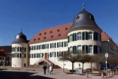 The Schloss Bergzabern features thick stone walls, multiple floors, and large windows that characterize the architectural style of German defensive residences.