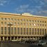 Berlin-Tempelhof Airport is a preserved airport in Tempelhof-Schöneberg, consisting of a sprawling terminal building with a curved facade of light natural stone. The building wraps around the former airfield in a semicircular arc and is accessible through several entrance doors along the front face.