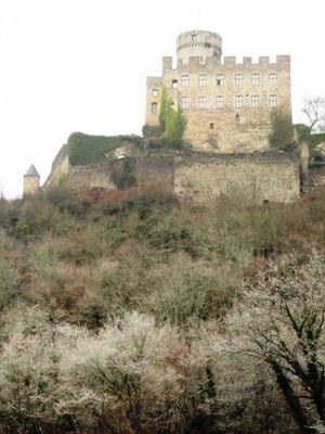 The stone fortress rises above the Elzbach River on a slate rock formation, featuring an 800-year-old tower keep and multiple architectural elements from different periods.
