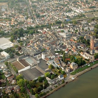 Eltville extends along the Rhine River with five districts, including historic timber-frame buildings and a medieval fortress overlooking the water.