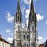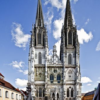 Regensburg Cathedral is a Gothic cathedral in Regensburg, Germany, with two towers that rise 105 meters into the sky. The nave extends over 86 meters and is divided into three aisles supported by strong buttresses.
