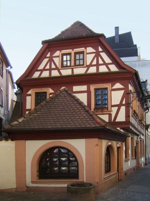The Zum Spinnrädl restaurant occupies a red-beamed timber house with baroque-style roof and medieval window panes in central Kaiserslautern.
