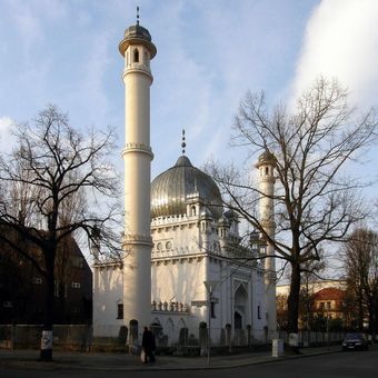 The Berlin Mosque is an Islamic place of worship in Charlottenburg-Wilmersdorf, featuring two tall minarets and a prominent central dome. The building displays Islamic architectural elements and accommodates approximately 400 worshippers inside.