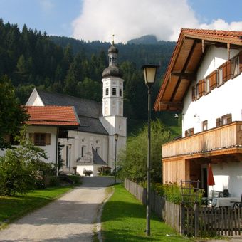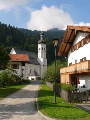 Sachrang stands at 738 meters elevation between Geigelstein and Spitzstein mountains, offering views toward the Zahmer Kaiser mountain in Tyrol.