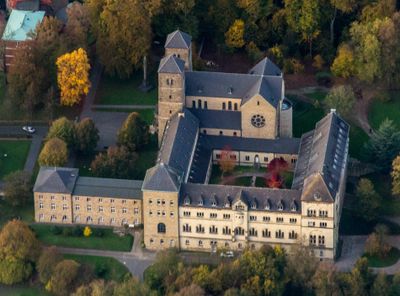 The monastic complex features neo-Romanesque architecture with a central abbey church, multiple guest houses, and extensive grounds in North Rhine-Westphalia.