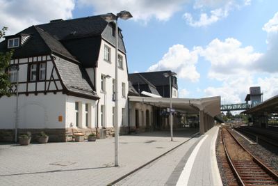Sonneberg Central Station is a railway station with five platform tracks that connects multiple regional railway lines in Thuringia. The building, constructed in 1907, displays Heimatstil architecture and sits at 387 meters elevation.