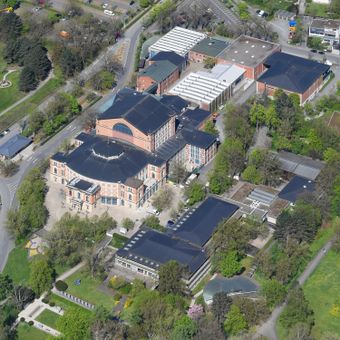The Bayreuth Festival Theatre is an opera house on a green hill built primarily from wood with 1,974 seats arranged in a single wedge formation. Its architecture with a double proscenium arch was designed specifically for Wagner's works and creates a special acoustic balance between the orchestra and singers.