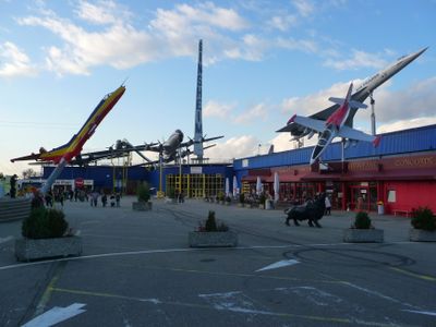 Two supersonic aircraft, the Concorde and the Tupolev Tu-144, are displayed outdoors at an angle and can be examined from close distance. These two planes were rivals in the race for the fastest passenger flight and are rare exhibits to see together in one place.