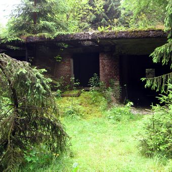 Adenauervilla is an unfinished three-story ruin in a forest near Duppach with around 600 square meters of floor space. The building sits at 605 meters elevation among dense trees and still shows the outlines of its original design, though it now appears weathered and hollow.