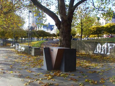 The granite memorial measures 70 centimeters in height and 120 centimeters in width, situated along the Rhine River at Frankenwerft.