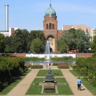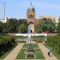 St. Michael's Church is a brick building in Berlin-Mitte featuring a distinctive central domed tower instead of the originally planned double-tower facade. The structure stands prominently at Michaelkirchplatz 15, displaying its Neo-Gothic architectural style clearly in the urban landscape.