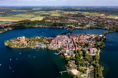 Ratzeburg sits on an island between three connected lakes, forming a natural fortress with medieval buildings and narrow streets across the water.