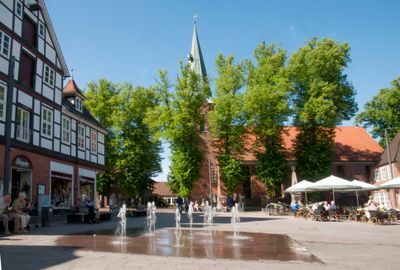 Bad Bevensen extends across an area at 25 meters elevation, featuring numerous health facilities, mineral springs, and the Dreikoenigskirche at its central marketplace.