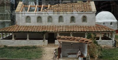 The archaeological site features preserved remains of Roman baths with walkways under a protective tent roof structure, displaying ancient heating systems and pools.