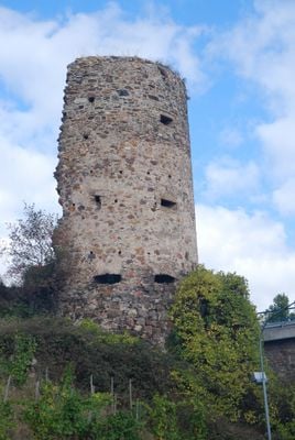 The remaining half of the round tower stands on a hill overlooking the road between Münster-Sarmsheim and Bingen am Rhein in Rhineland-Palatinate.