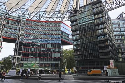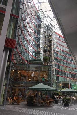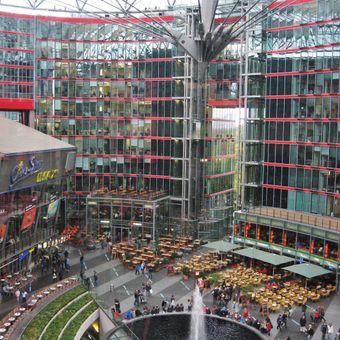 Architect Helmut Jahn designed this commercial ensemble that opened in 2000 on terrain previously occupied by the Berlin Wall's death strip, located near Potsdamer Platz which underwent comprehensive redevelopment following German reunification.