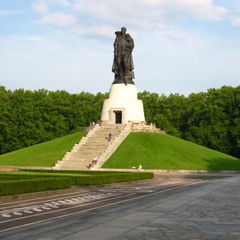 The Soviet cemetery carries Cyrillic inscriptions and is flanked by two colossal granite portals that lead visitors into a symmetrically arranged memorial area. On the central mound rises a 12-meter bronze figure holding a rescued child in one arm while crushing a broken swastika with a sword.