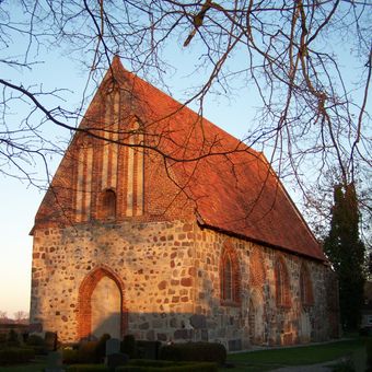 Kirche mit Friedhof, Feldsteinmauer, Tor und 5 Grabplatten 18. Jhr. und drei