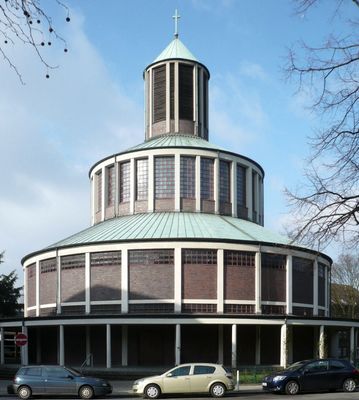 The Auferstehungskirche features a circular design with three layered window rings, constructed using Krupp steel and concrete with a diameter of 30 meters.
