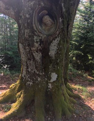 The sandstone figure of Christ at Balzer Herrgott stands partially encased within a large beech tree near Gütenbach village.