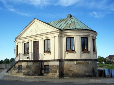 The building maintains its original structural elements while integrating into the modern urban landscape of Dresden's riverside district.