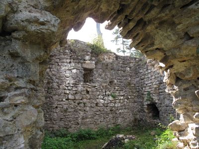 The residential tower's remains feature an unusual ground-level entrance in the north wall, departing from typical medieval entry placements. Additionally, an arrow slit positioned mid-way along the south wall is a detail rarely seen in similar fortified structures from this era.