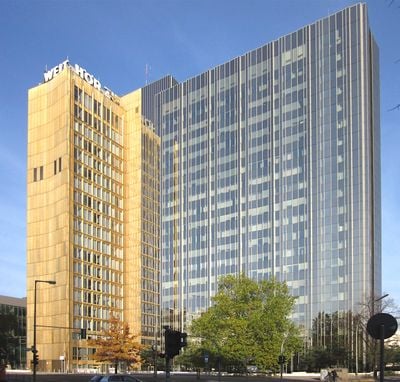 The 78-meter tall Axel Springer building features 19 floors with a distinctive metal and glass facade designed by architect Melchiorre Bega.