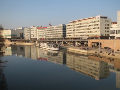 The Berliner Promenade extends 600 meters between Wilhelm Heinrich Bridge and Congress Hall, featuring concrete architectural elements above the riverbank.