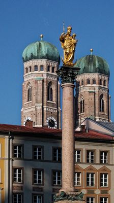 The Mariensäule stands 11 meters tall with a golden statue of Virgin Mary on top of a marble column in the center of Marienplatz.